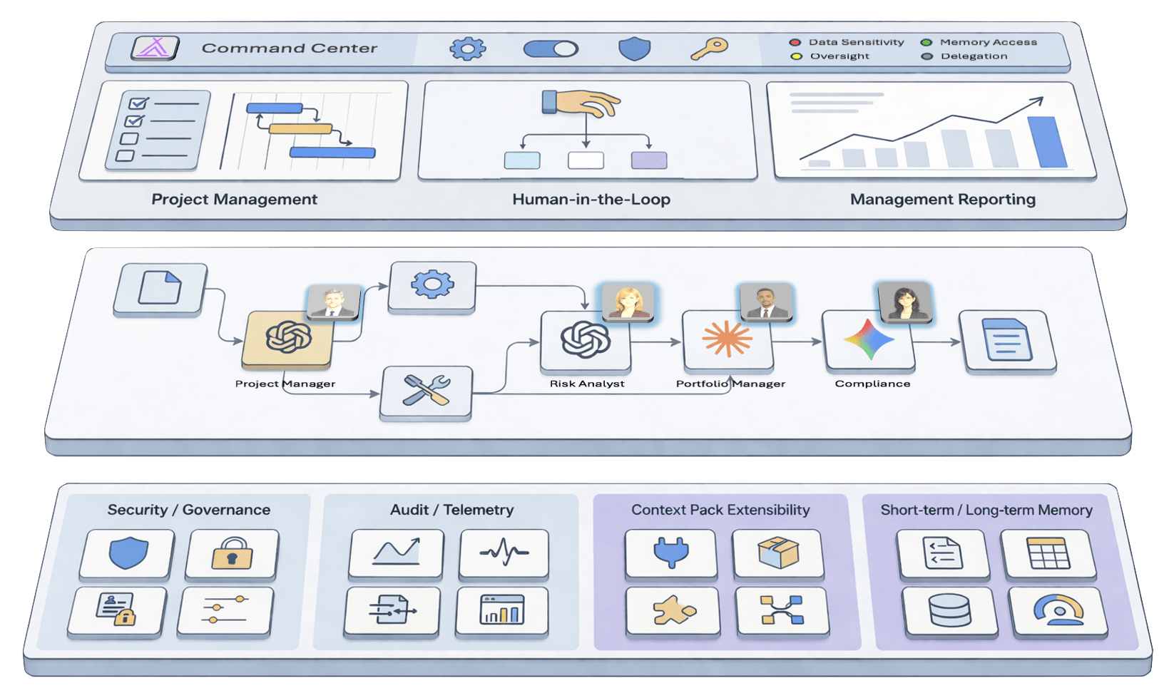 Manager agents leverage organizational constraints—including approved vendors, budgets, and project-based controls—to recruit and coordinate specialized worker agents, optimizing task execution.