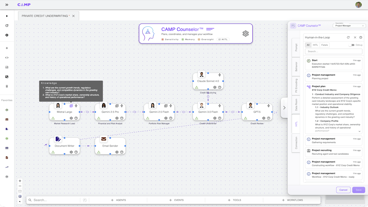 Provide an objective, and the Counselor constructs a full project plan, assembles a diverse team of agents, organizes execution, and governs outcomes—applying the same constraints real project managers use every day: budget, skills, suppliers, and performance.